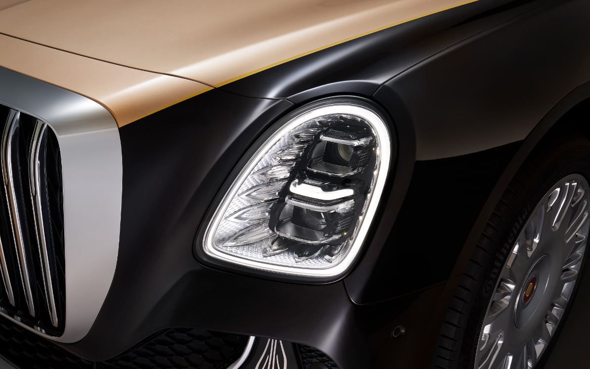 Передние фары выполнены в форме, где округлый верх (небо) и строгий низ (земля) воплощают древнюю концепцию гармонии мироздания. Внутренний рисунок в виде «золотого солнечного цветка» — прямая отсылка к философии Golden Sunflower, а декоративная структурная подсветка создаёт образ восходящего солнца, пробуждающего жизнь. Логически венчает фронтальную композицию фирменный автограф HONGQI — тонкая красная линия, проходящая по центру капота как символ преемственности поколений. Задние фары, напротив, стилизованы под аутентичные китайские дворцовые фонари — образ богатства, процветания и удачи, оберегающий и «освещающий путь».