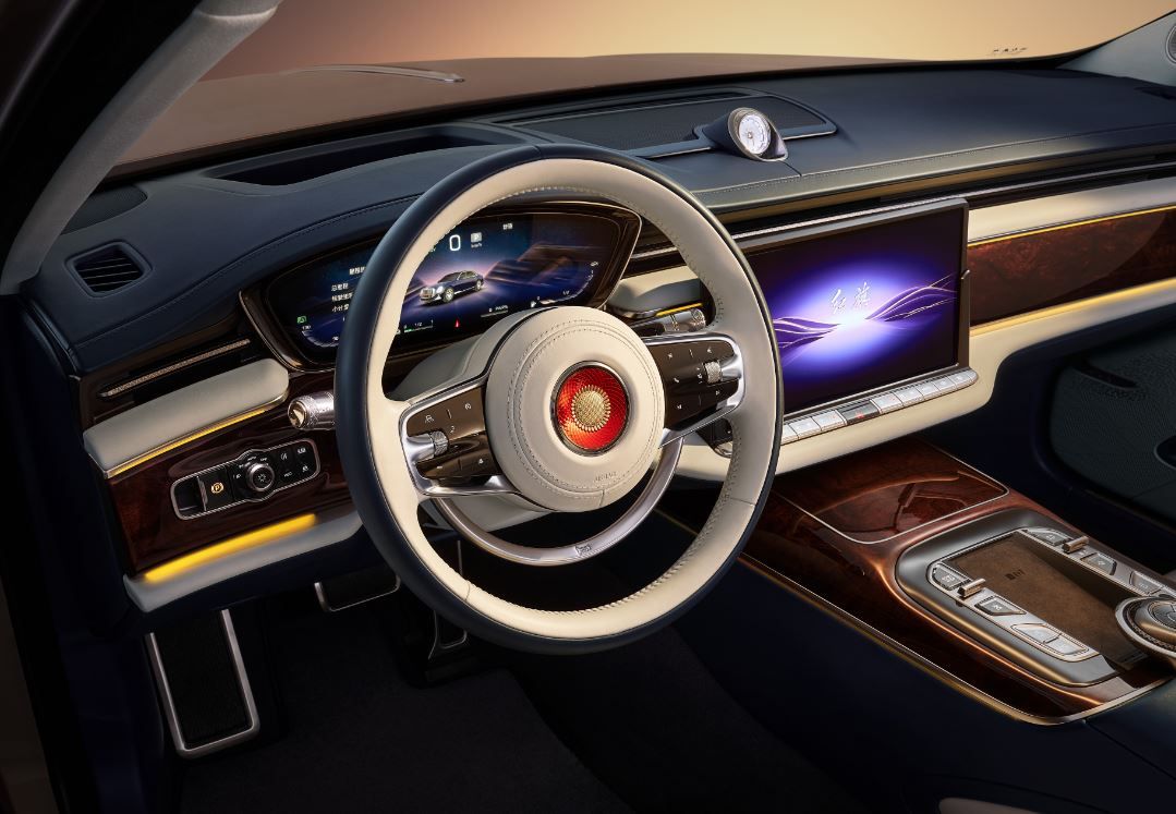 Дизайн руля выполнен по мотивам древнего китайского орнамента «зверь, держащий кольцо» («фу шоу хэнь хуань»). В традиционной культуре этот элемент украшал входные двери знатных домов, символизируя высокий статус и благородство. Такой же руль был на первом отечественном автомобиле HONGQI, что подчёркивает преемственность и национальную гордость.