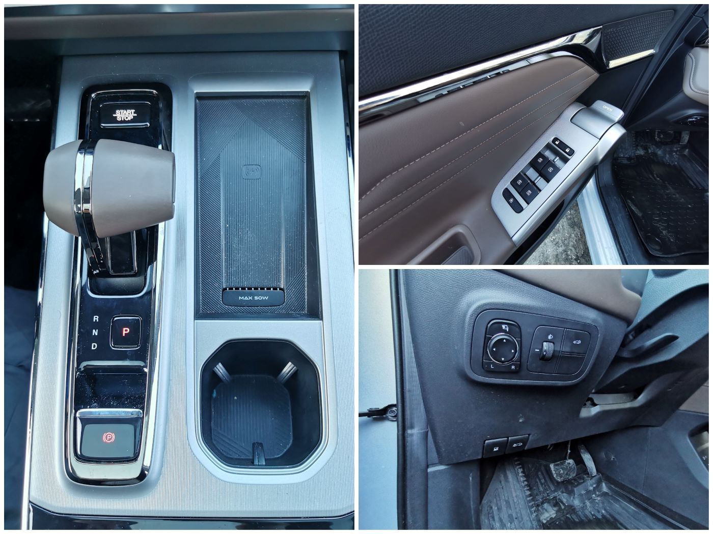 Многофункциональный мультируль немного срезан снизу, объемный на обхват, удобный. Центральный тоннель двухуровневый, с площадкой беспроводной зарядки 50 Вт, подстаканниками и ящиком для мелочей сверху, и сквозной нишей с разъемами USB-A и USB-C и розеткой прикуривателя внизу.