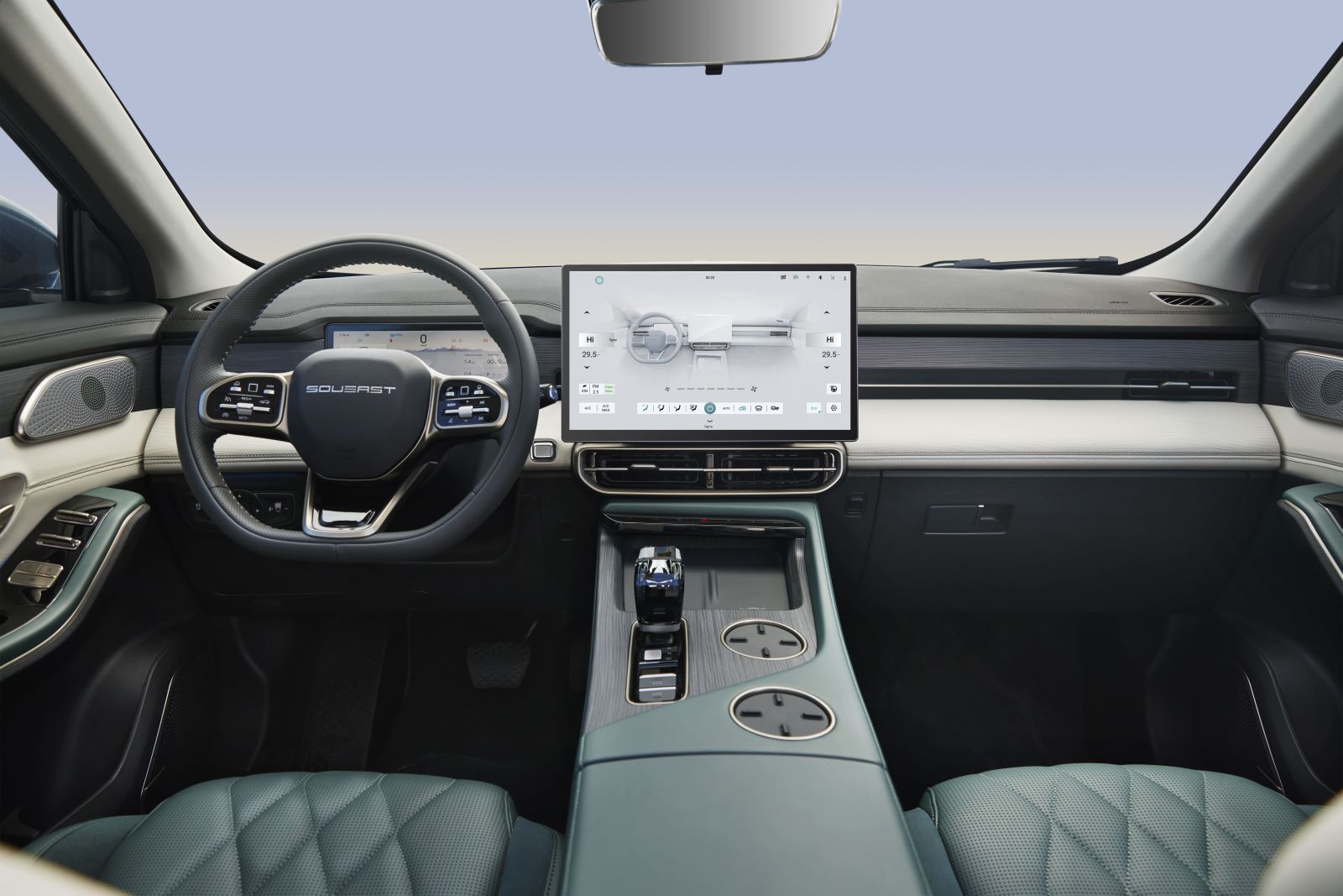 Изысканность внутреннего мира SOUEAST S09 подчеркивает селектор трансмиссии, который выполнен в виде кристалла со 176 полированными гранями. Информация о поездке выводится нацифровую приборную панель с экраном диагональю 10.25 дюймов. В центральной части приборной панели находится экран мультимедийной системы Full HD с диагональю 15.6 дюймов, в котором расположены дополнительные органы управления и меню информационно-развлекательной системы.