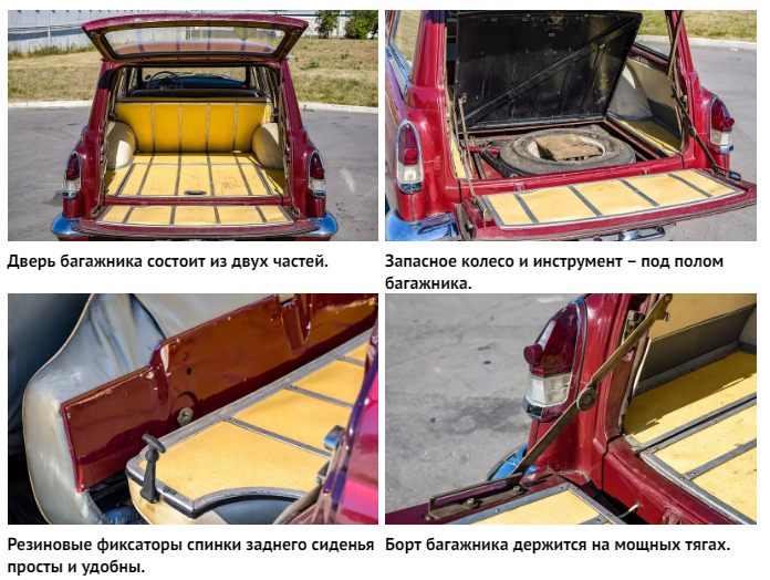 ГАЗ 22 отличался внушительным багажным объёмом — по техническим данным, два кубометра полезного пространства. Грузоподъёмность составляла 400 кг, а запасное колесо размещалось под полом багажника. Для доступа к нему требовалась разгрузка, но это позволяло сохранять чистоту.